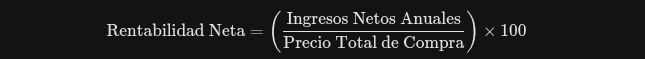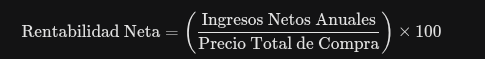 La rentabilidad neta es la cifra que realmente te interesa, ya que te da una imagen mucho más precisa y realista de tu beneficio. Esta sí que considera todos los gastos asociados a la propiedad.
