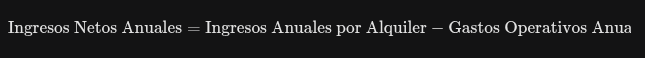 | Otros Gastos | Gastos de hipoteca (intereses), costos de servicios no cubiertos por el inquilino (p. ej., agua o luz de zonas comunes). |