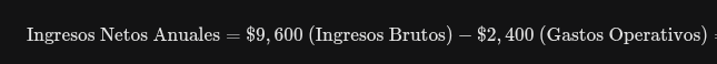 - Ingresos Anuales por Alquiler: $\$800 \times 12 = \$9,600$